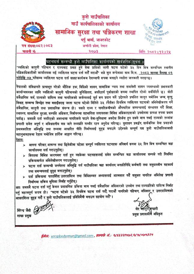 घटनादर्ता सम्बन्धी कुशे गाउँपालिका कार्यालयको सार्वजनिक सूचना ।।