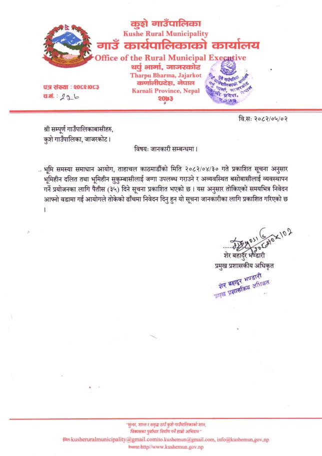 भूमिहिन दलित, भूमिहिन सुकुम्बासी र अव्यवस्थित बसोबासीले निवेदन दिने सम्बन्धी पैँतीस (35) दिने सूचना
