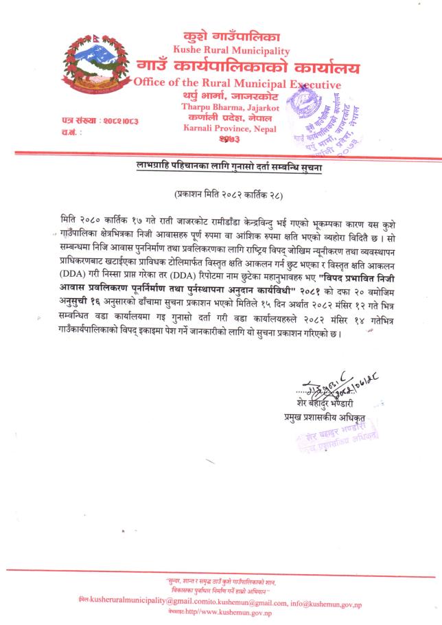 लाभग्राहि पहिचानका लागि गुनासो दर्ता सम्बन्धी सूचना